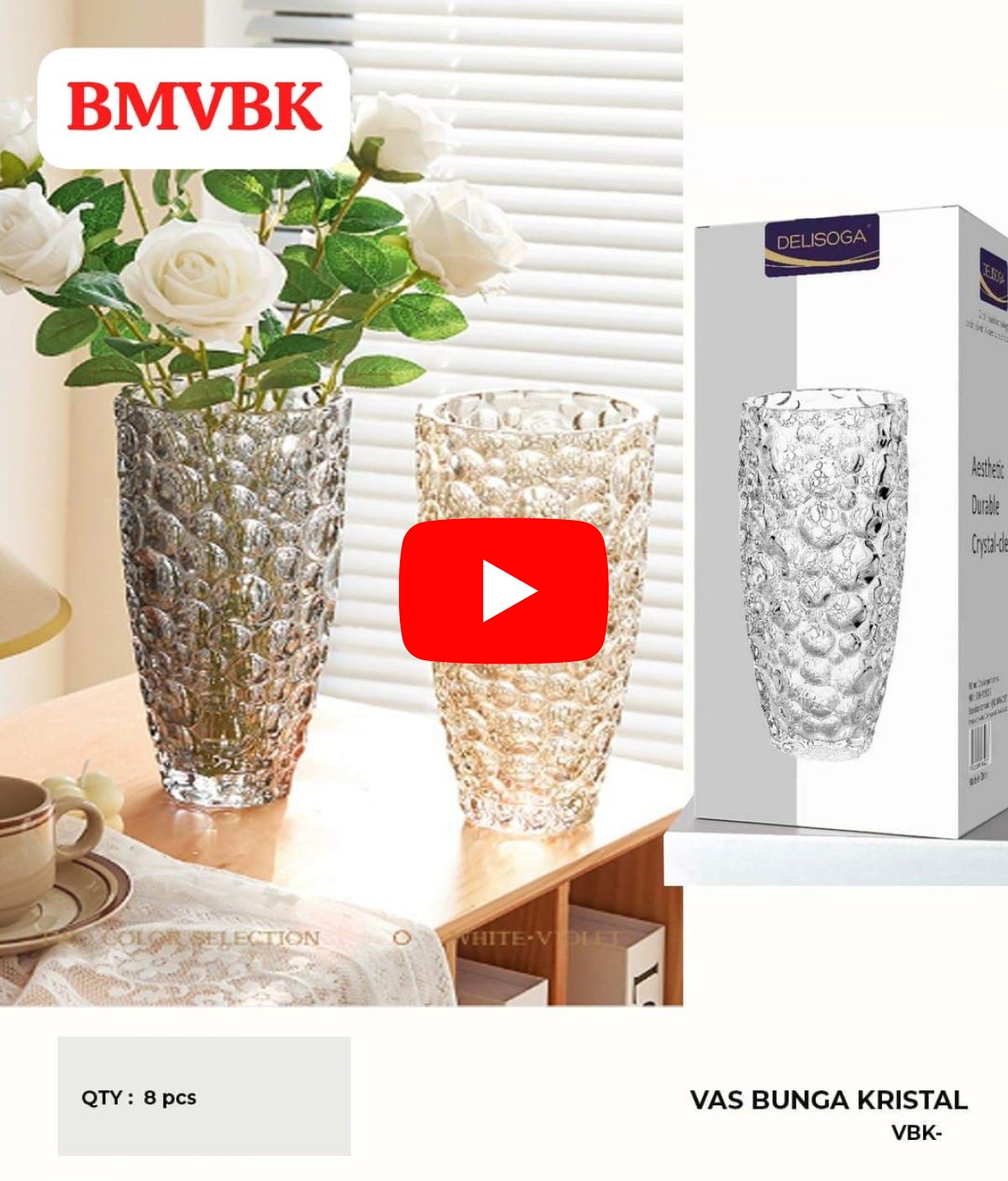 VAS BUNGA KRISTAL BMVBK TINGGI 25.5CM DIAMETER 10CM ISI 8 PCS