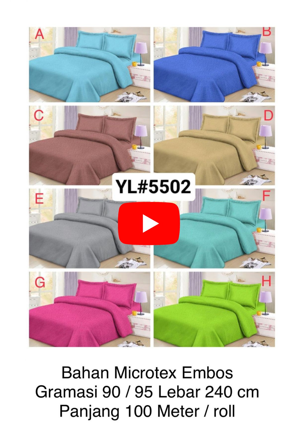 BAHAN SPREI MICROTEX EMBOS YL5502 GRAMASI 90 / 95 LEBAR 240CM PANJANG 100 M / ROLL ( TERDAPAT 8 WARNA YANG DAPAT DIPILIH & TOLONG SERTAKAN HURUF PADA WARNA YANG DI PILIH PADA SAAT PEMESANAN )BAHAN SPREI 1 ROLL = 100 METER Stock = 10 ROLL