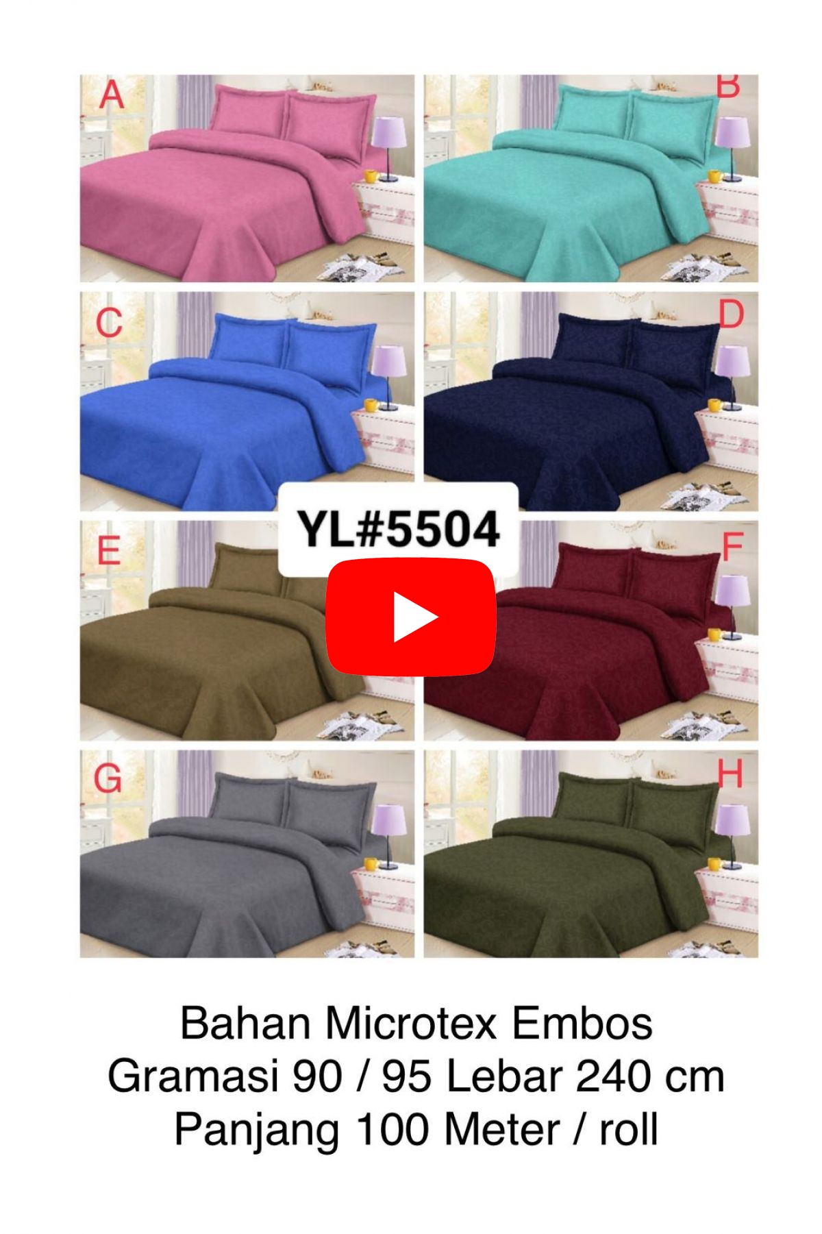 BAHAN SPREI MICROTEX EMBOS YL5504 GRAMASI 90 / 95 LEBAR 240CM PANJANG 100 M / ROLL ( TERDAPAT 8 WARNA YANG DAPAT DIPILIH & TOLONG SERTAKAN HURUF PADA WARNA YANG DI PILIH PADA SAAT PEMESANAN )BAHAN SPREI 1 ROLL = 100 METER Stock = 10 ROLL
